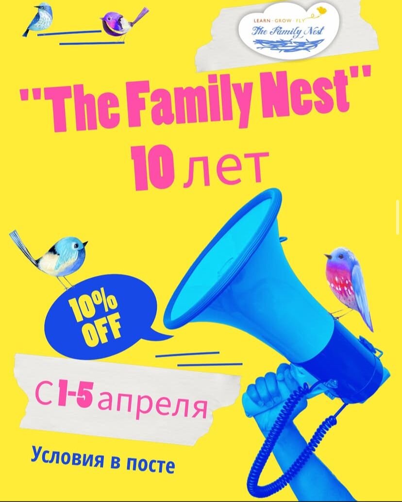 Нам 10 лет! Празднуем вместе! Друзья, детский клуб "The Family Nest" отмечает свой 10-й день рождения! Это 10 лет радости, открытий и теплых встреч. Спасибо, что вы с нами! В честь праздника дарим выгодные предложения - только с 1 по 5 апреля: ✅Купи 1 абонемент в группу неполного дня пребывания (50 000 тг.) и получи 10% скидку на "Art-Laboratory". ✅ Купи 1 абонемент в группу неполного дня пребывания (50 000 тг.) и получи 10% скидку на абонемент летнего лагеря. ✅Оплати сразу 2 абонемента в группу неполного дня пребывания - получи 10% скидку! ✅Купи 1 абонемент на группу полного дня (вместо 137 000 тг) и заплатите 130 000 тг!